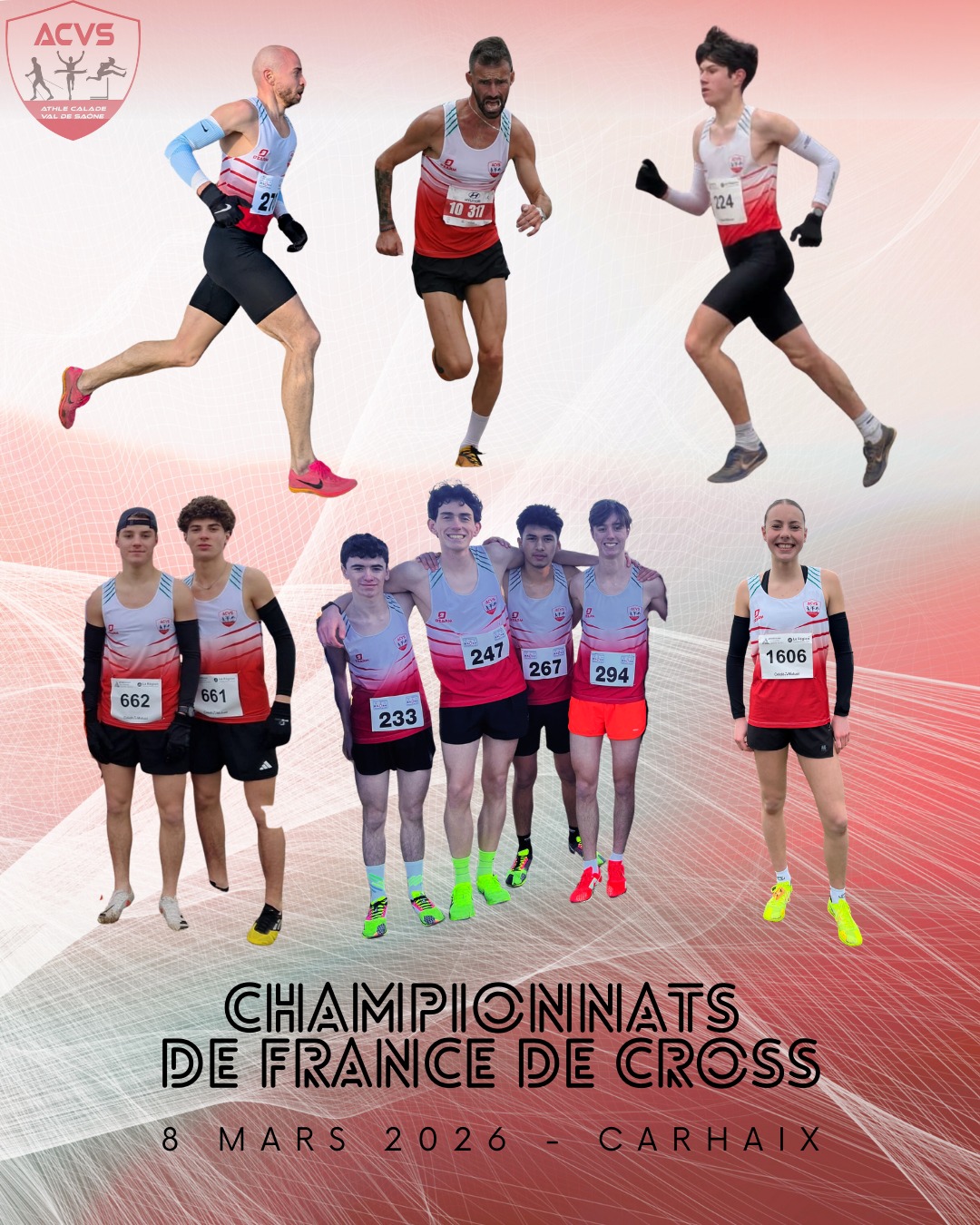 U18 garçons (6560m) : départ à 11h35 pour Louis Estublier, Thibaut Baron, Lucas Sabot, Tobias Lacroix, Clément Baron et Marin Beaufils. 2e par équipe aux régionaux, ils peuvent aller chercher une belle place collective.